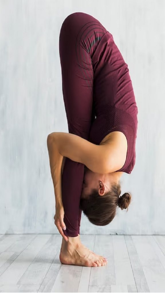Hastapadasana also known as Forward Bend Pose is derived from two Sanskrit words where Hasta means hand and Pada means foot. The name highlights the primary goal of this pose – to touch your hands on your feet.