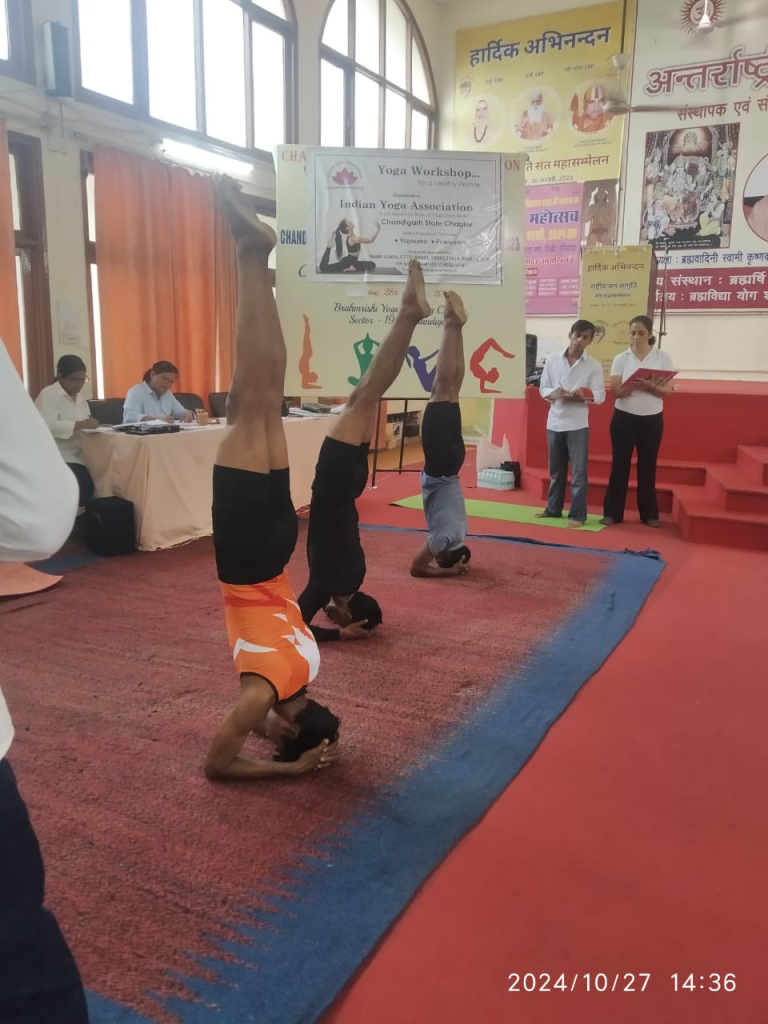 Chandigarh State UT Chapter of the Indian Yoga Association successfully hosted a grand ‘Yoga Utsav on October 27, 2024, at Brahmrishi Yoga College, Sector 19, Chandigarh, with more than 200 participants attending the event. The festival was inaugurated with a lamp lighting ceremony, followed by Ganesh Vandana. It celebrated the holistic benefits of yoga and featured a variety of challenging asanas, including Akarna Dhanurasana, Dhanurasana, Ardha Matsyendrasana, Chakrasana, Hanuman Asana, Natarajasana, Bakasana, Shirshasana, and Virabhadrasana, all skilfully performed by dedicated sadhaks.