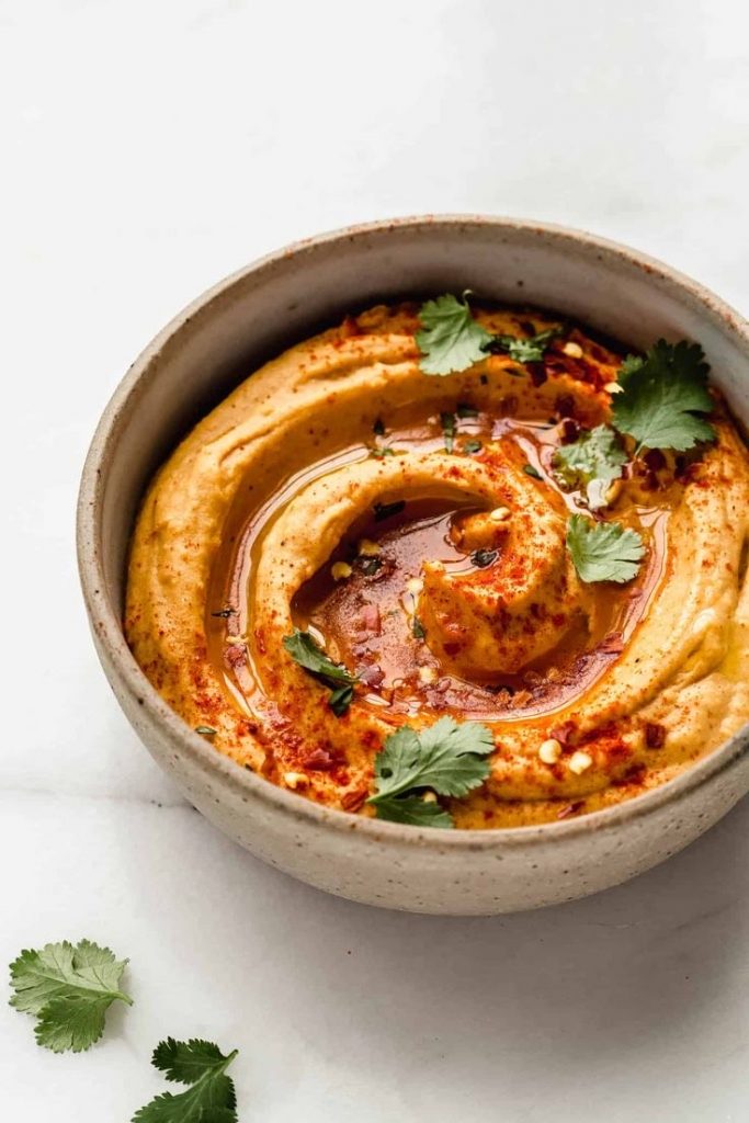 Sweet Potato Hummus is rice in protein, fiber, vitamins and essential nutrients. Sweet Potato is a good source of vitamin A, C, and B6, potassium, copper and manganese. It promotes gut health. Olive oil used in the Hummus is rich in vitamin E and K that reduces the risk of heart disease and controls weight. Sesame seed is a good source of calcium that promotes bone health.