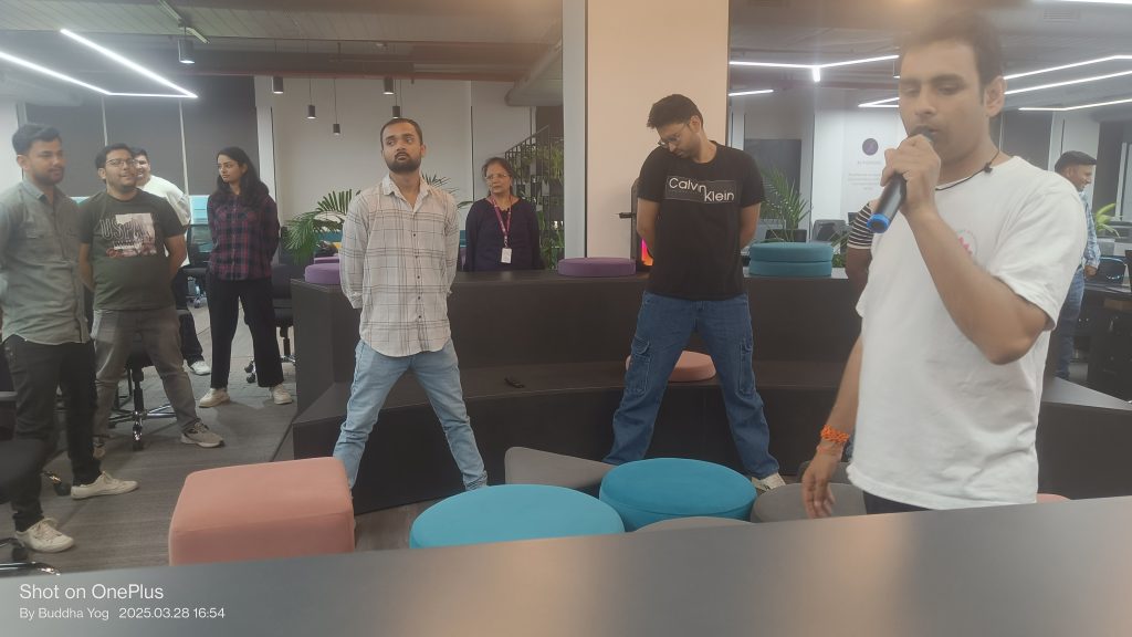 On 28th March 2025, Yogacharya Arjun Singh of Buddha Yogshala conducted impactful yoga sessions addressing both corporate wellness and women’s health. The first session was held at Vision Group, Tower C, Galaxy Business Park, Noida, where employees participated in a corporate yoga class aimed at managing stress, improving posture, and enhancing overall workplace productivity through practical yogic techniques and guided meditation.