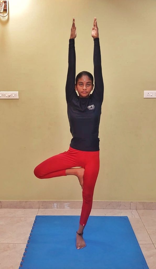 Now, you can feel that you are staying here in the Vrksasana Urdhva Hastasana for about 6 breaths or at your convenience, and keep your gazing straight in front of you.