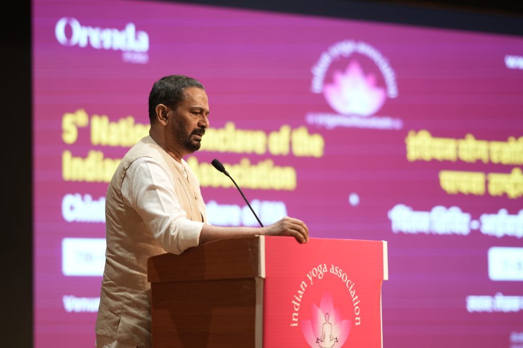 This was followed by the insightful address of Shri P.N. Ranjit Kumar, Joint Secretary and OSD (IDY Coordination), Ministry of Ayush, who placed the Conclave’s purpose within a national perspective. He shared the findings of a recent survey that revealed a heartening trend: in every 35 people in India, at least one person practices yoga regularly, and many others practice occasionally. This, he emphasized, is proof that yoga remains an integral part of India’s cultural fabric, expanding quietly yet powerfully into mainstream living. He highlighted the Indian Yoga Association’s crucial role in sustaining this growth — guiding practitioners, institutions and communities towards authentic, traditional and scientifically grounded yogic pathways.