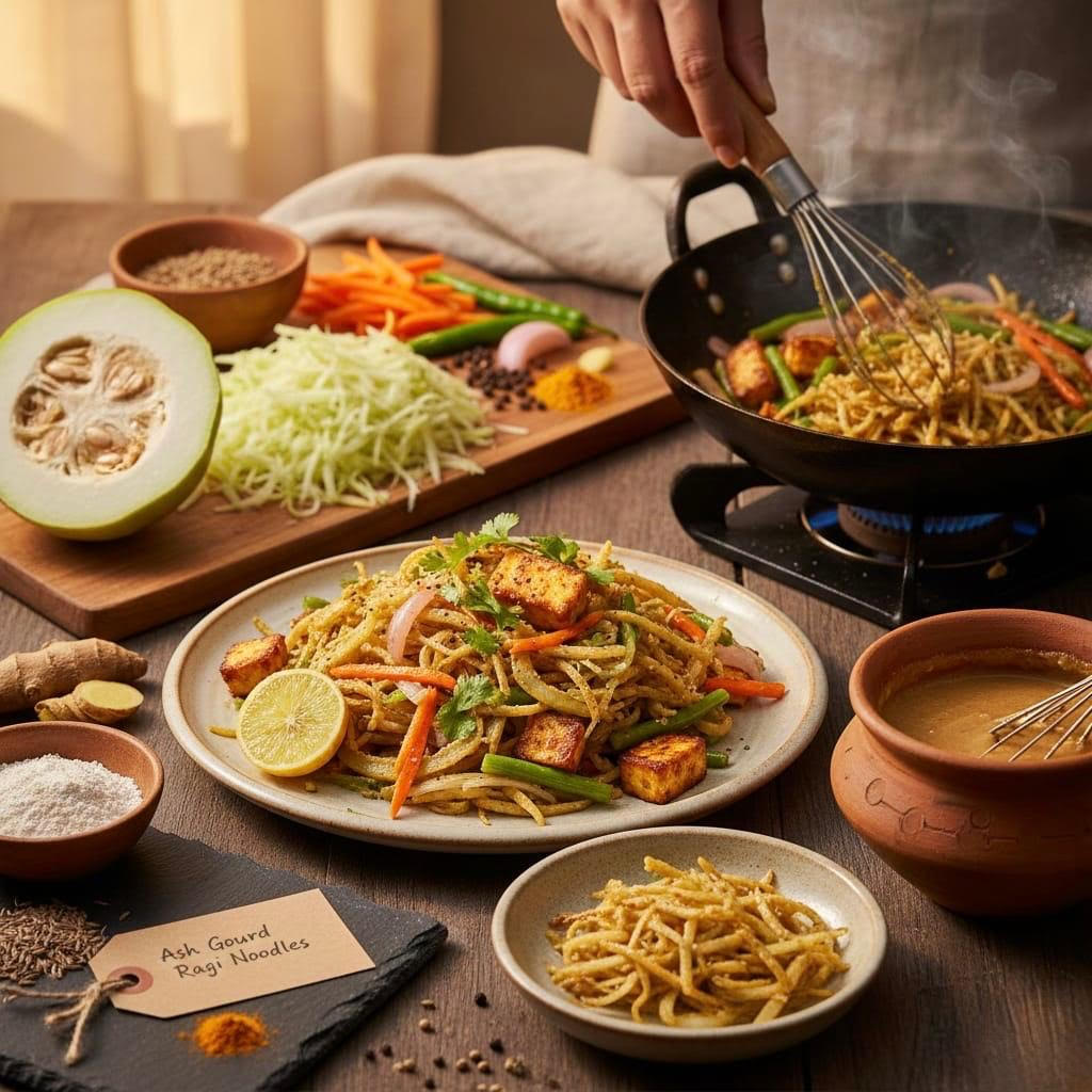 ght, hydrating, and nutrient-dense alternative to conventional grain-based pasta, this wholesome recipe beautifully blends the cooling nature of ash gourd with the grounding and mineral-rich goodness of ragi (finger millet). Naturally gluten-free and gut-friendly, it is ideal for those following a yogic and holistic lifestyle.